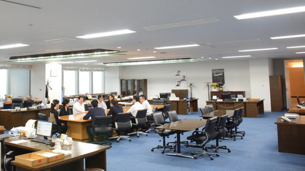 Despite his position as head of 30,000 employees, Ueki shares an open room with the company’s board of directors. Desks line the perimeter of the room, and there’s a large table positioned in the center.